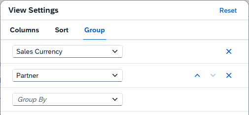 Über die Eigenschaften der Tabelle können wir nun über die Gruppierung Zwischensummen erzeugen. Dazu wechseln wir auf den Reiter "Group" und definieren eine Gruppe Währung und eine zweite Gruppe Partner.
