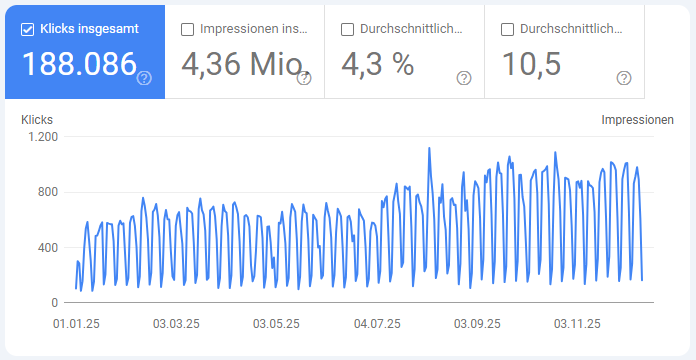 Die Google Suche ist immer noch eine relevante Messgröße für Sichtbarkeit und Reichweite, auch wenn die letzten Jahre immer mehr neue Suchmaschinen auf den Markt gekommen sind. Dieses Jahr lief es noch einmal besser als im Vergleich zum letzten Jahr. Das mag mit einer besseren Sichtbarkeit, mehr Themen und mehr Interaktionen zu tun haben. Grundsätzlich nähern wir uns auch den 500 Blogartikeln und haben damit genug Grundlage für die Suchmaschine.