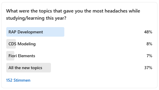 In diesem Jahr haben sich die Artikel vor allem auf die aktuellen Themen eingezahlt, die euch auch im Alltag herumtreiben, wie RAP, BTP und ABAP Cloud. Grundsätzlich gab es hier zahlreiche Themen aus den verschiedenen Bereichen, sodass die meisten Leser Themen von Interesse bekommen haben sollten. Grundsätzlich hat die Umfrage aber auch gezeigt, dass ihr an RAP und Fiori allgemein mehr Interesse habt, da diese Themen den meisten Umfang und die größte Komplexität haben. Insgesamt kamen 140 neue Artikel auf dem Blog dazu, sowie einige Übersichtseiten.