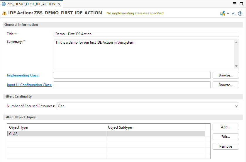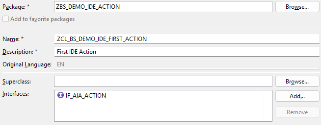 To define an implementation for our action, we can use "Browse" Search for an existing class or start the creation wizard using the link in front of the field. Unfortunately, the appropriate interface is not predefined here. Let's give the ZCL_BS_DEMO_IDE_FIRST_ACTION class a name.